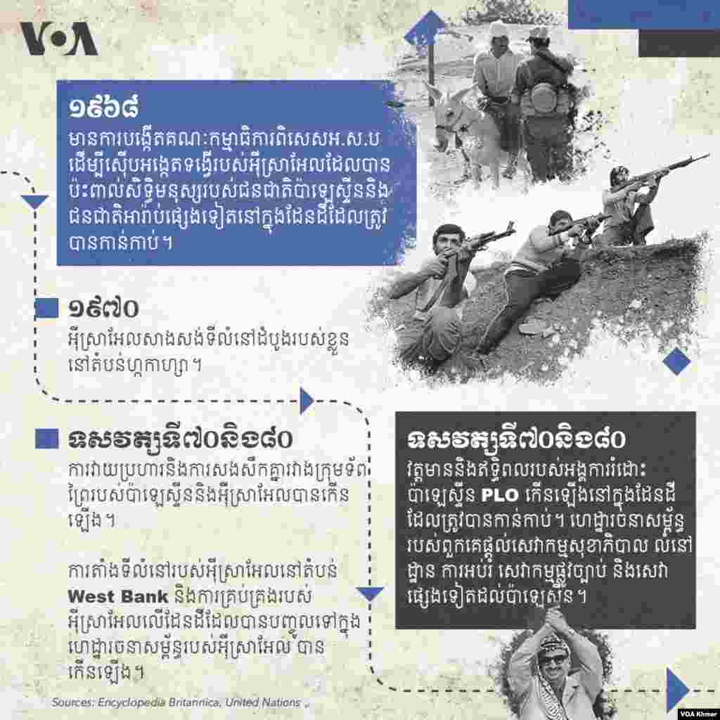 កាលពីថ្ងៃទី៧ តុលា ឆ្នាំ២០២៣ ក្រុមហាម៉ាស់បានឆ្លងចូលភាគខាងត្បូងអ៊ីស្រាអែលដោយសម្លាប់មនុស្ស១២០០នាក់និងចាប់ជម្រិតមនុស្ស២៤០អ្នកផ្សេងទៀត។ ដើម្បីឆ្លើយតប អ៊ីស្រាអែលបានប្រកាសធ្វើសង្រ្គាមជាមួយហាម៉ាស់និងបានវាយប្រហារតាមអាកាសនិងវាយលុកផ្លូវគោកទៅក្នុងតំបន់ហ្កាហ្សា។ បន្ទាប់ពីការប្រយុទ្ធច្រើនជាង៩០ថ្ងៃ ជនជាតិប៉ាឡេស្ទីនជាង២ម៉ឺននាក់ក្នុងតំបន់ហ្កាហ្សាត្រូវបានសម្លាប់ និងជាច្រើនលាននាក់ទៀតបានផ្លាស់ទីលំនៅ។ ផ្ទះសម្បែង សាលារៀន ព្រះវិហារឬអគារផ្សេងៗត្រូវបានកម្ទេច។ អ្នកជំនាញនិយាយថានេះជាការប្រយុទ្ធដ៏សាហាវបំផុតក្នុងប្រវត្តិសាស្ត្របច្ចុប្បន្ន។ ហាម៉ាស់បន្តឃុំខ្លួនចំណាប់ខ្មាំង១០០នាក់នៅហ្កាហ្សា។ អ៊ីស្រាអែលបានរាយការណ៍ថាទាហានរបស់ខ្លួនចំនួន១៧៥នាក់បានស្លាប់។ ខាងក្រោមនេះជាភាគ២នៃ តារាងពេលវេលាដែលបង្ហាញពីប្រវត្តិរបស់ប៉ាឡេស្ទីននិងអ៊ីស្រាអែល ដែលបណ្តាលឲ្យមានការវាយប្រហារតាំងពីថ្ងៃទី៧តុលា ឆ្នាំ២០២៣មក។